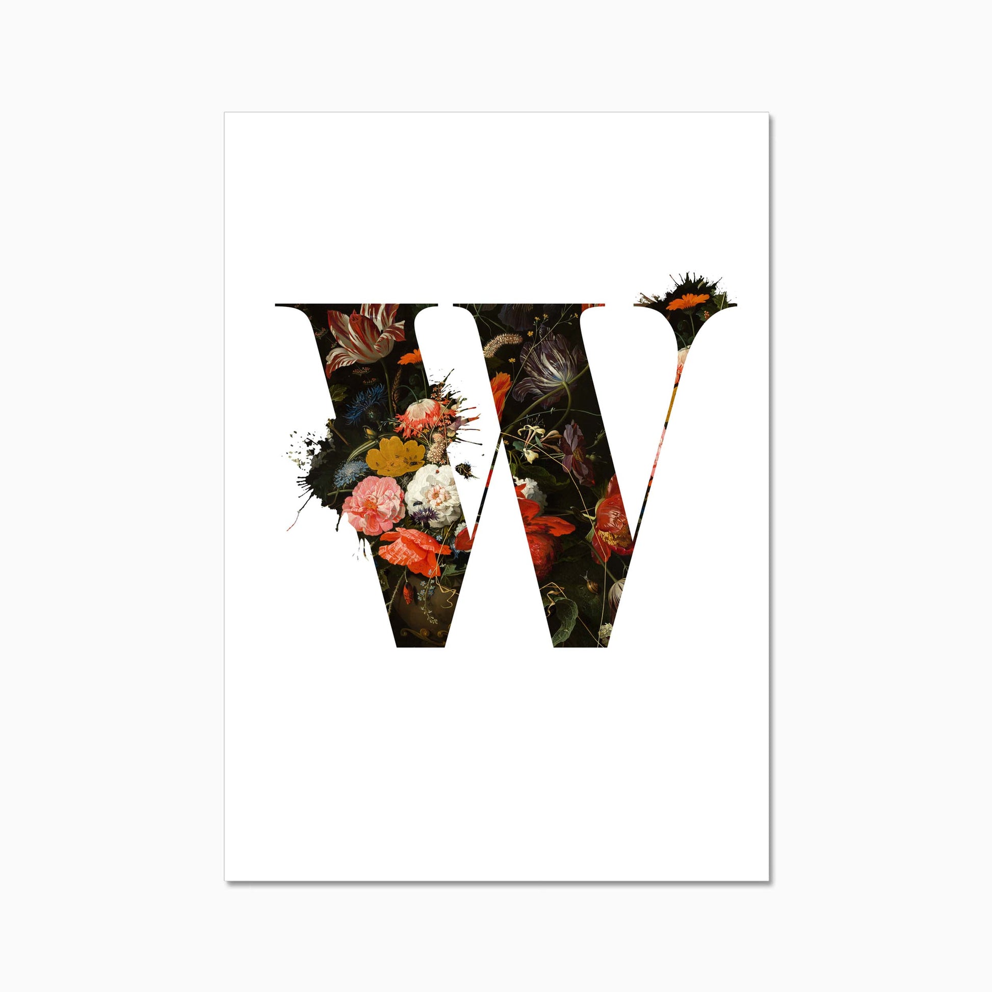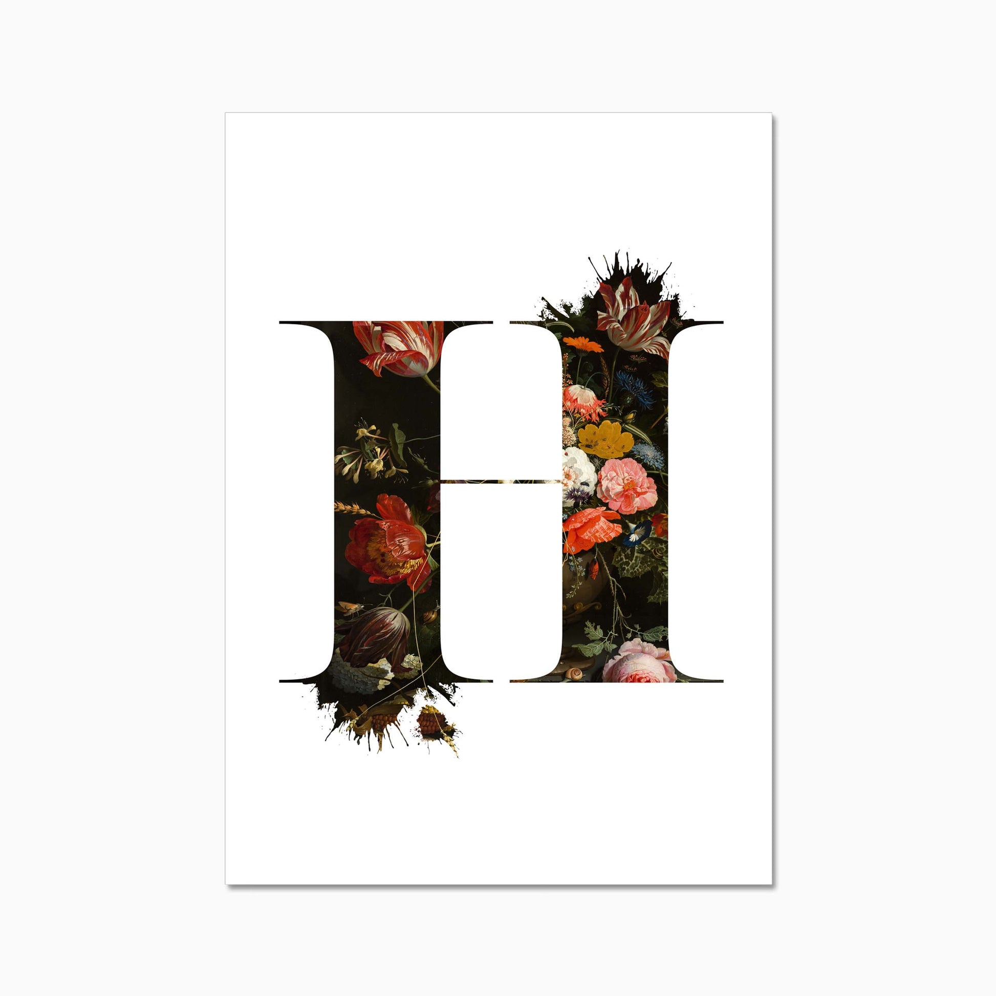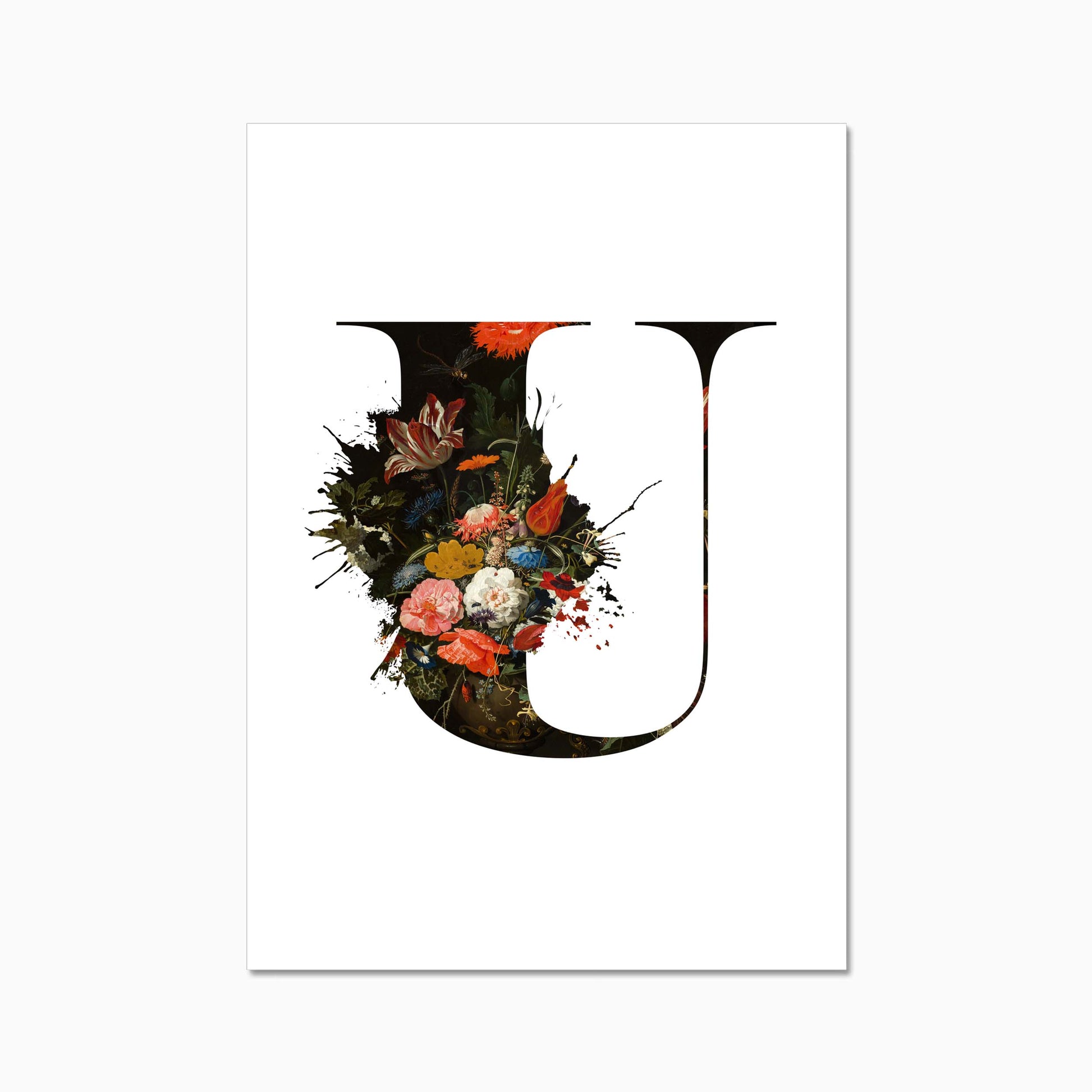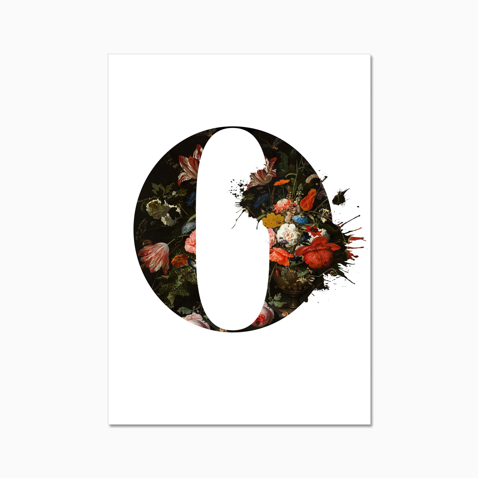 The letters are filled with a beautiful old dutch still life painiting featuring flowers and some little insects.