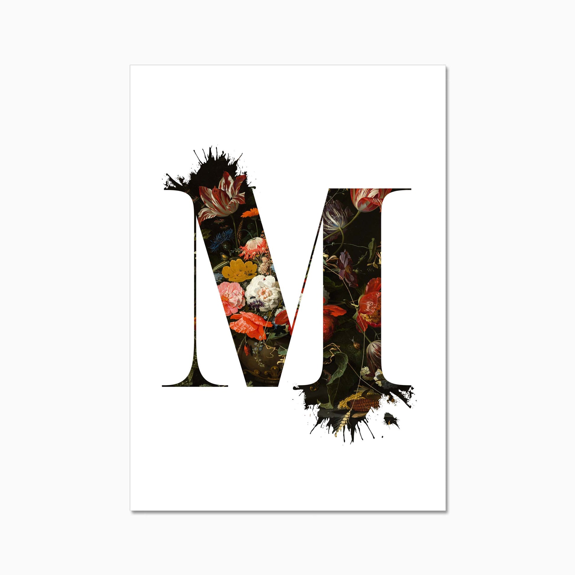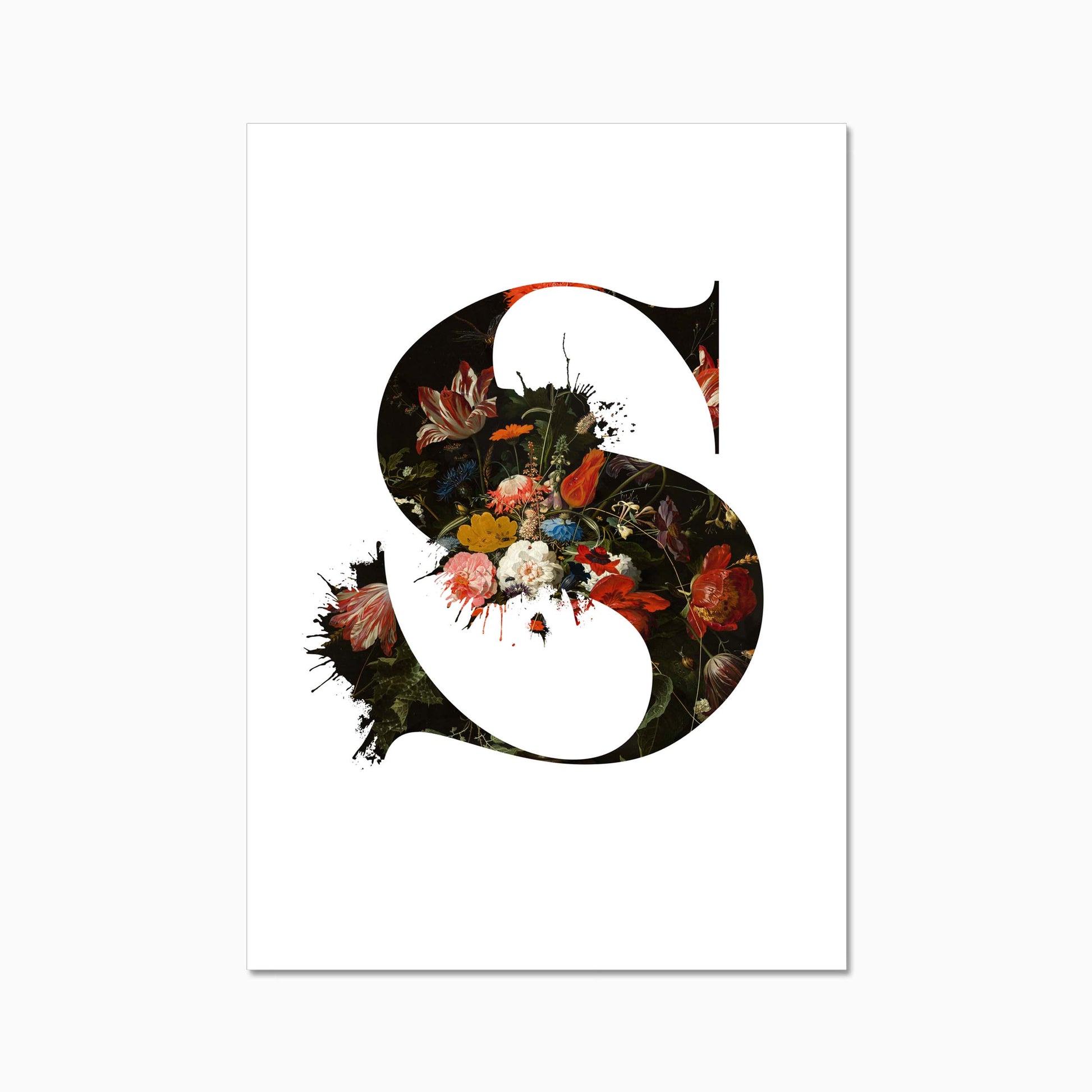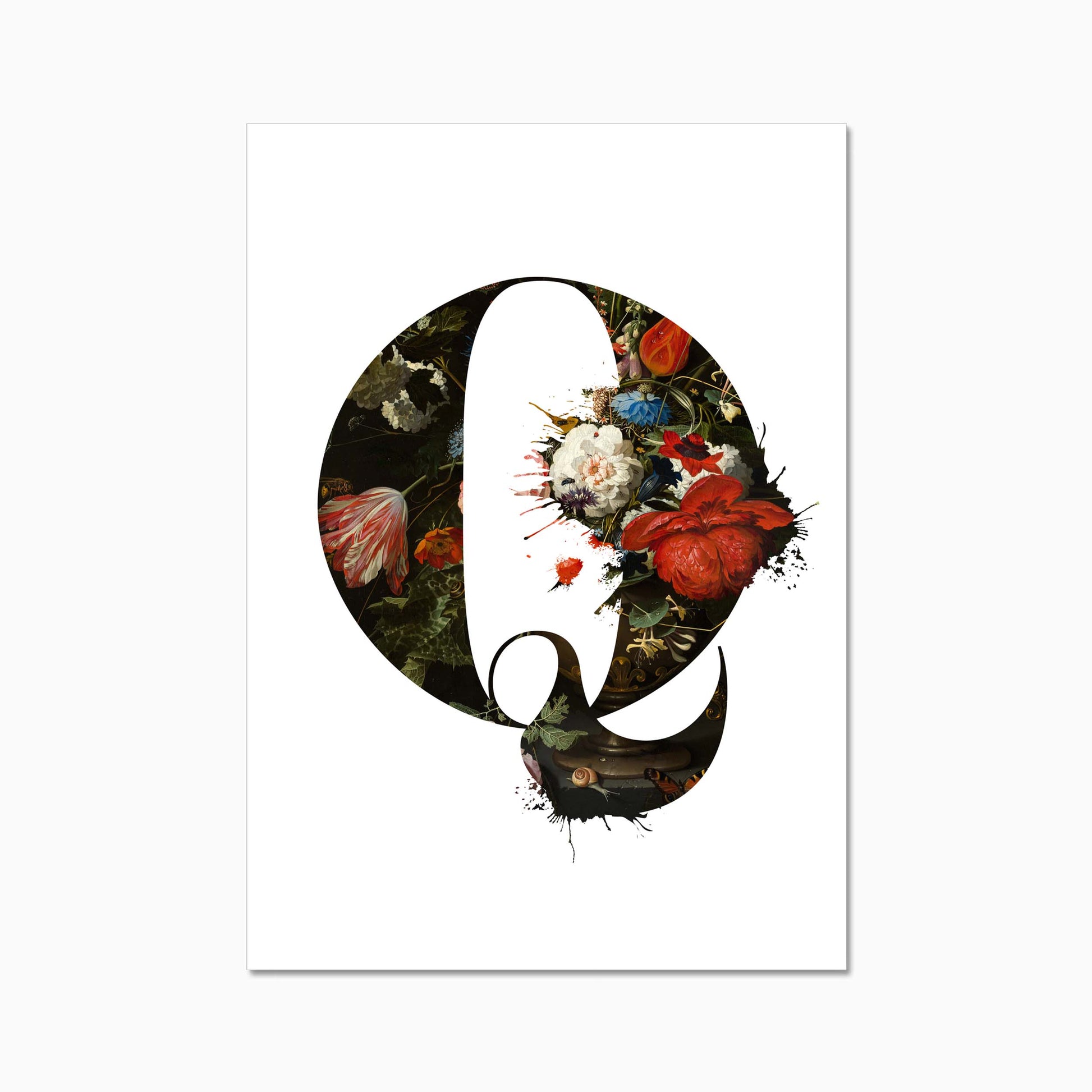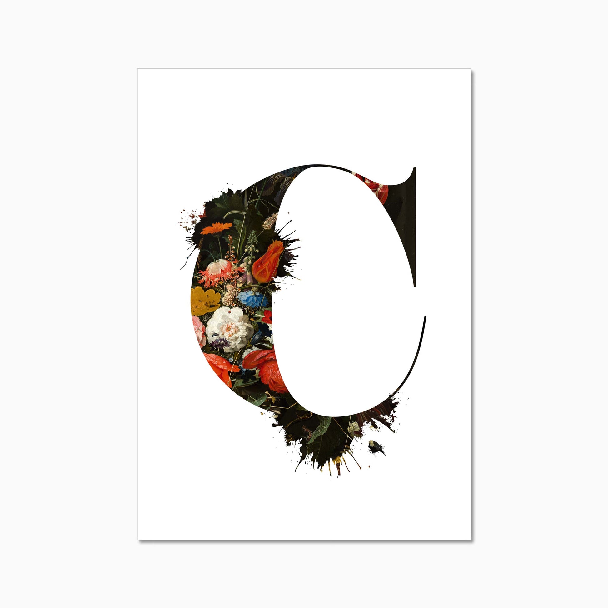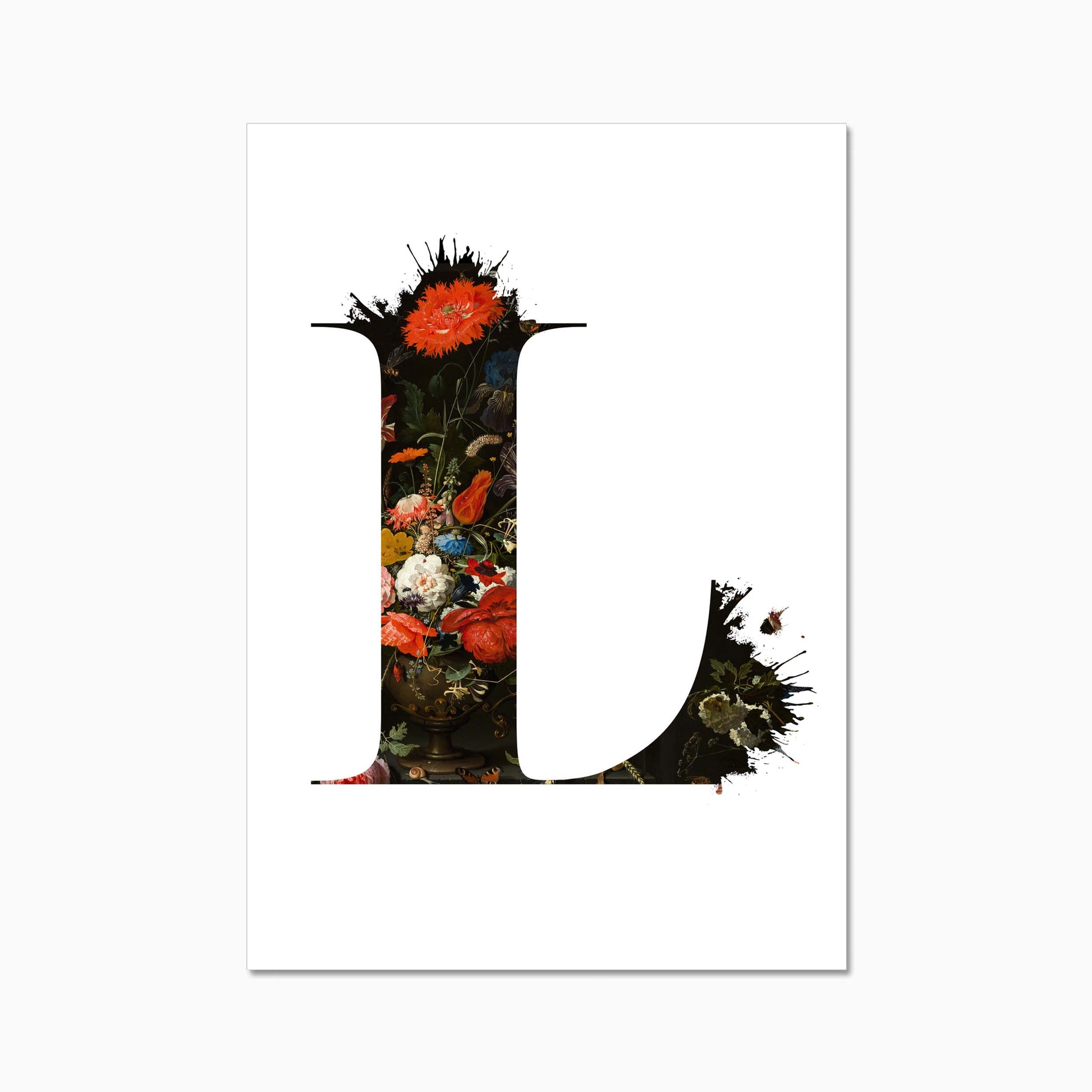The letters are filled with a beautiful old dutch still life painiting featuring flowers and some little insects.