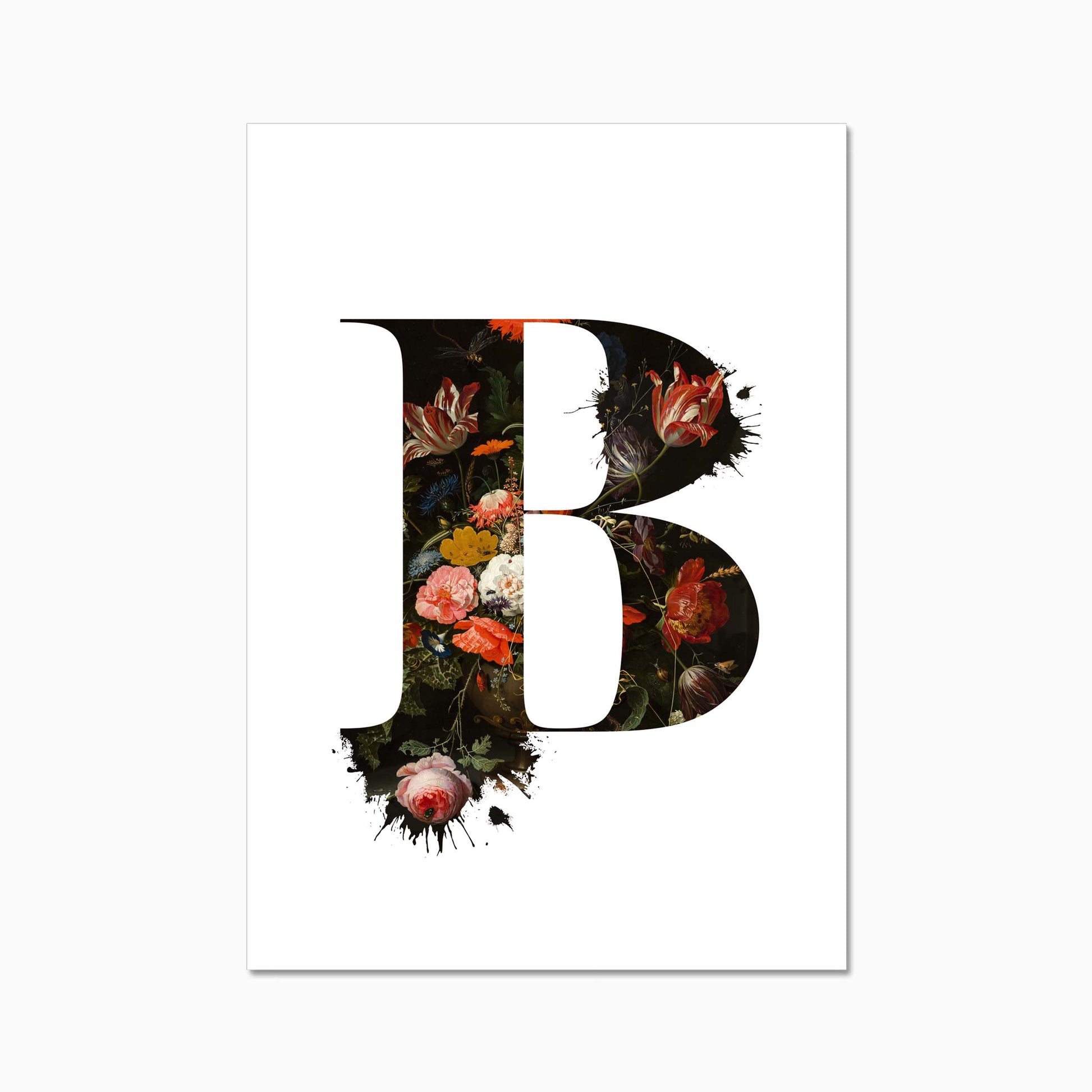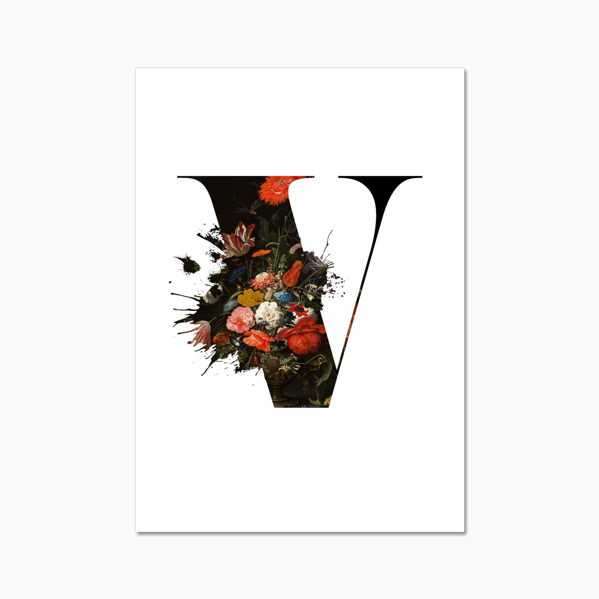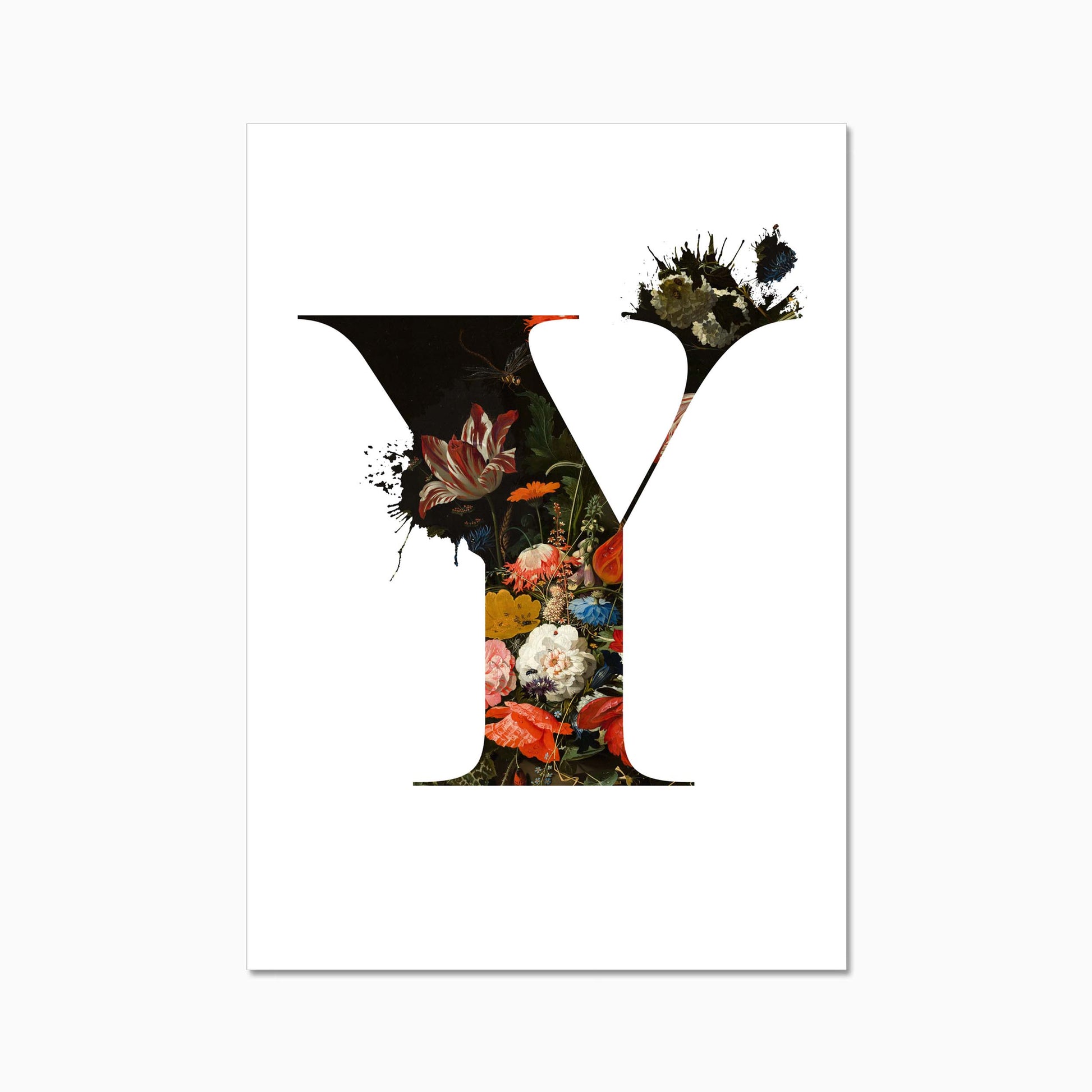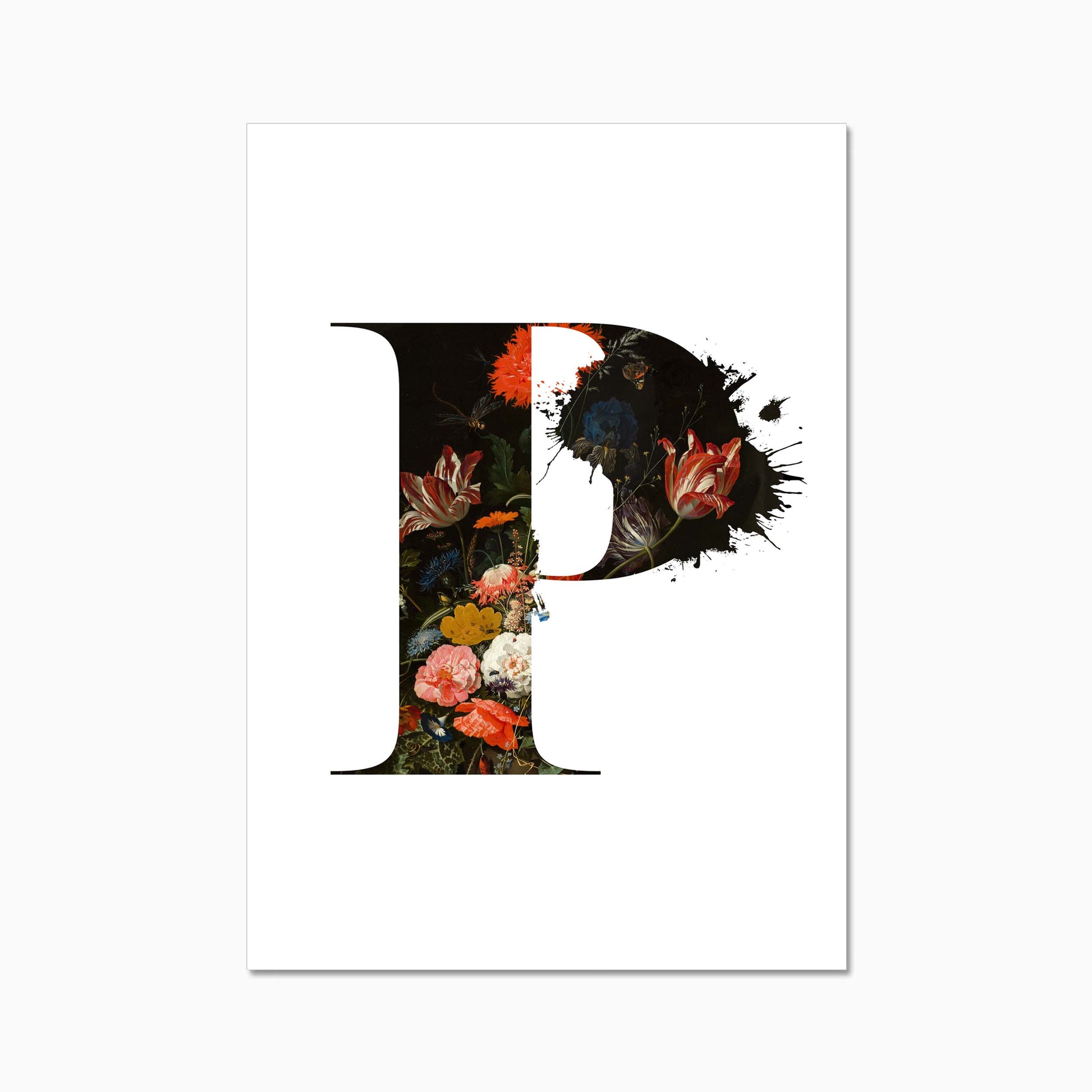 The letters are filled with a beautiful old dutch still life painiting featuring flowers and some little insects.