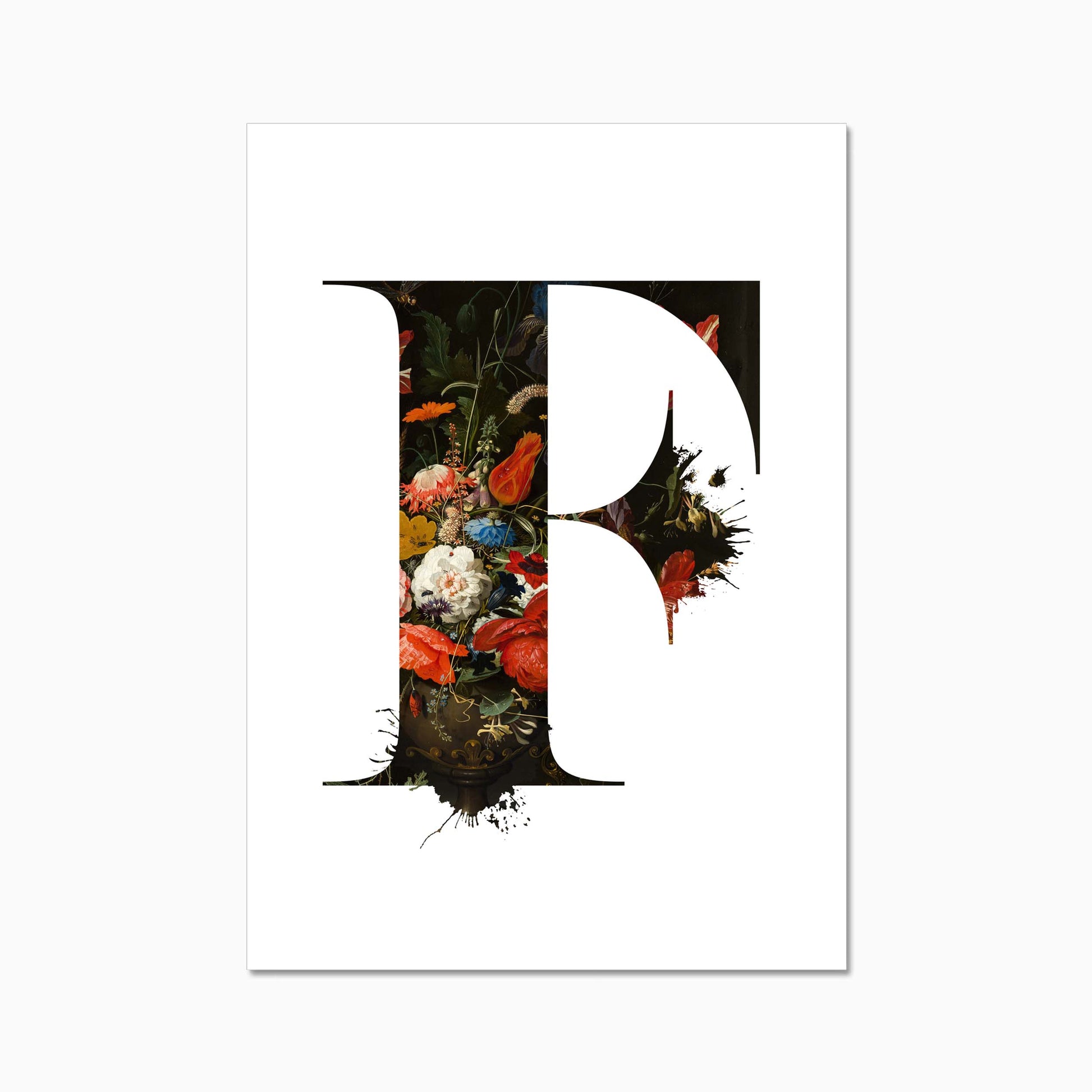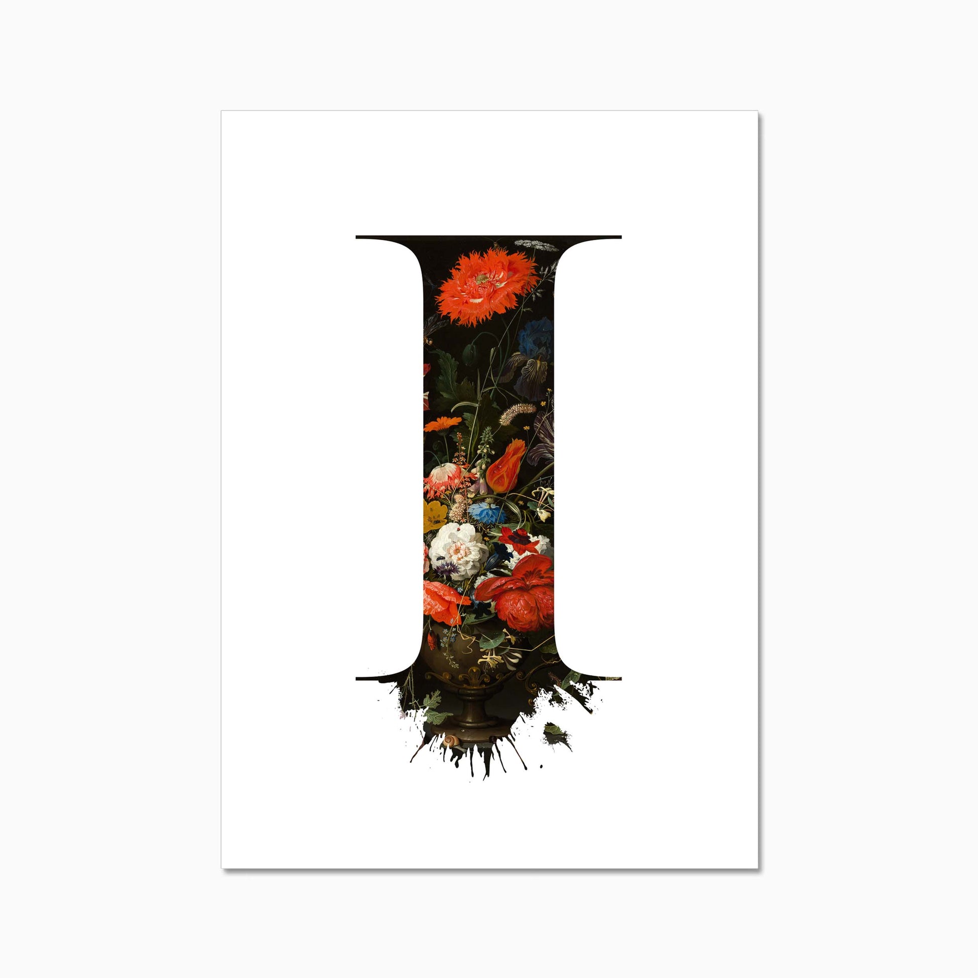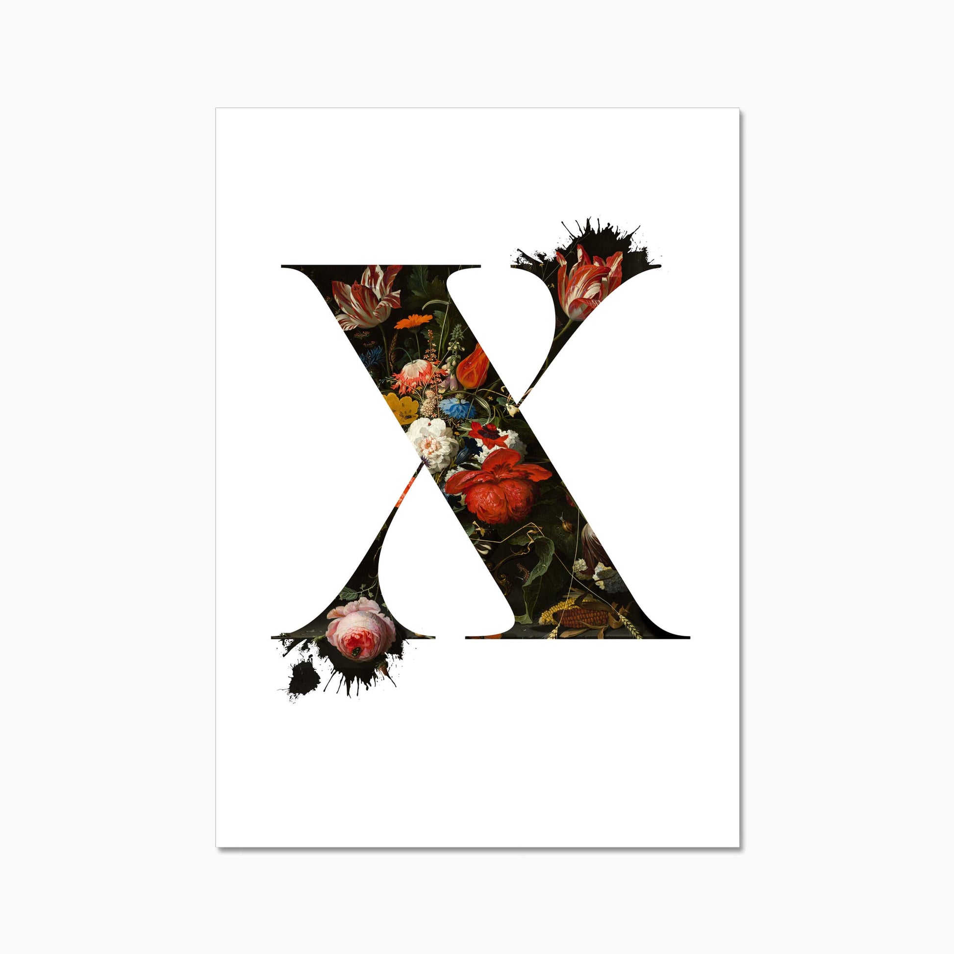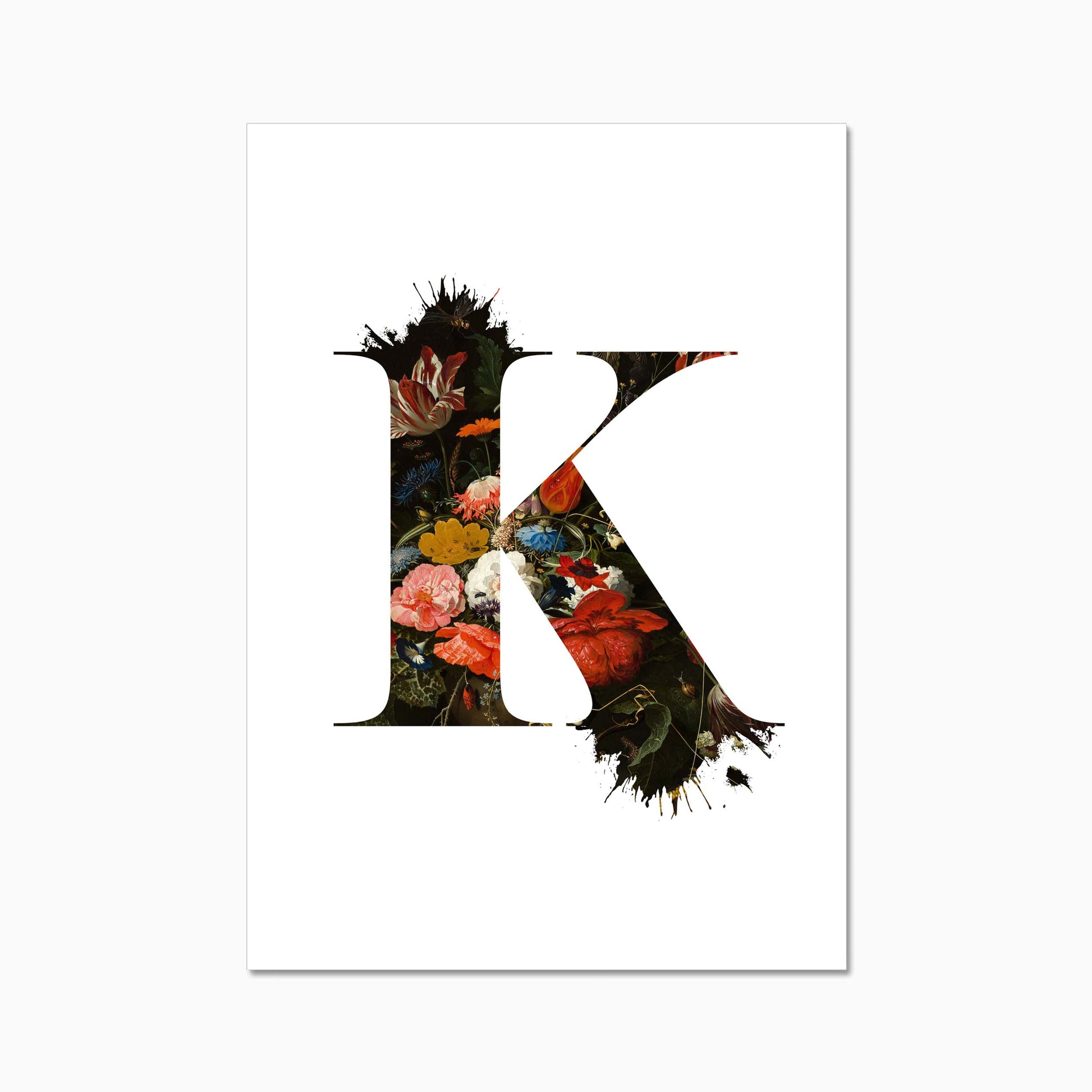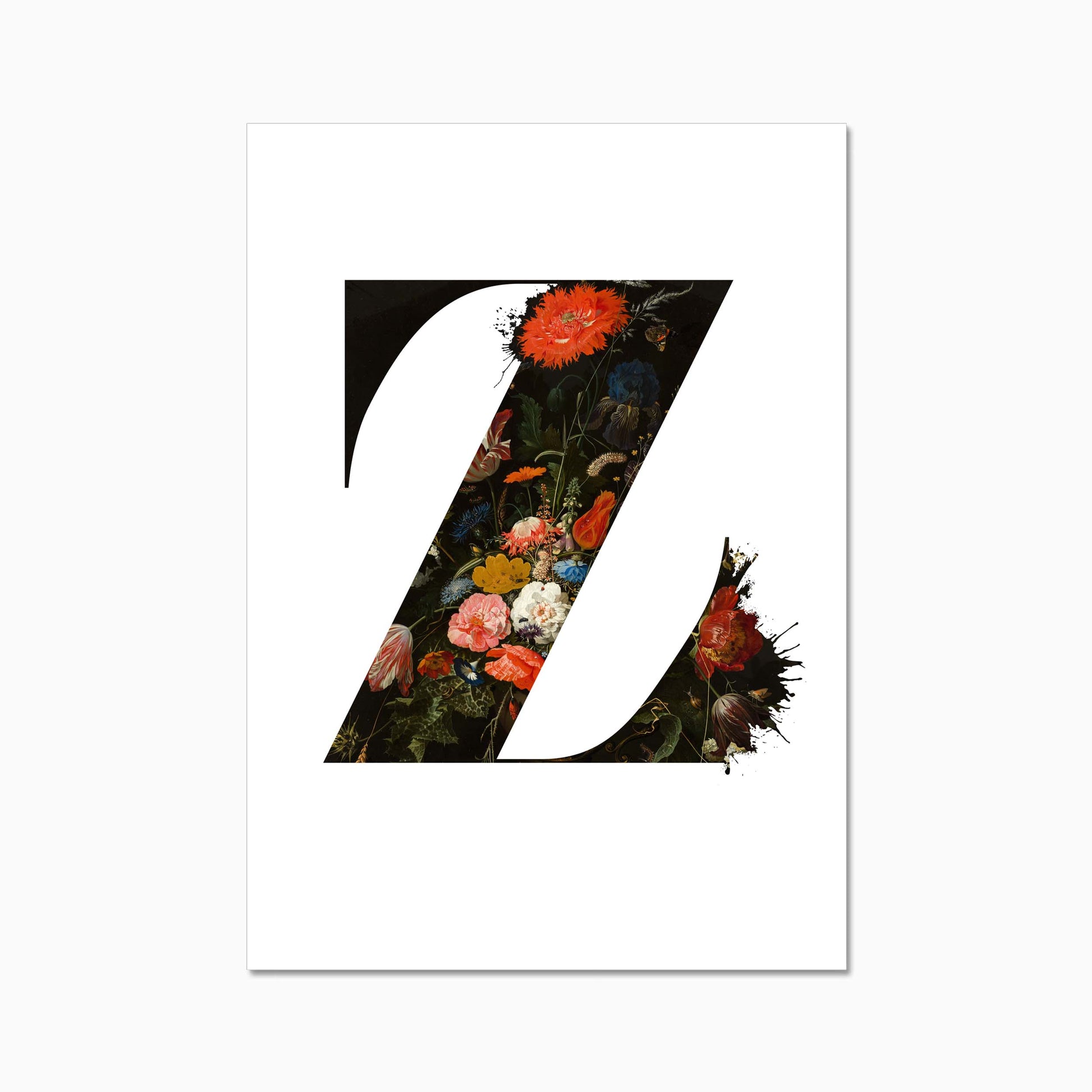The letters are filled with a beautiful old dutch still life painiting featuring flowers and some little insects.