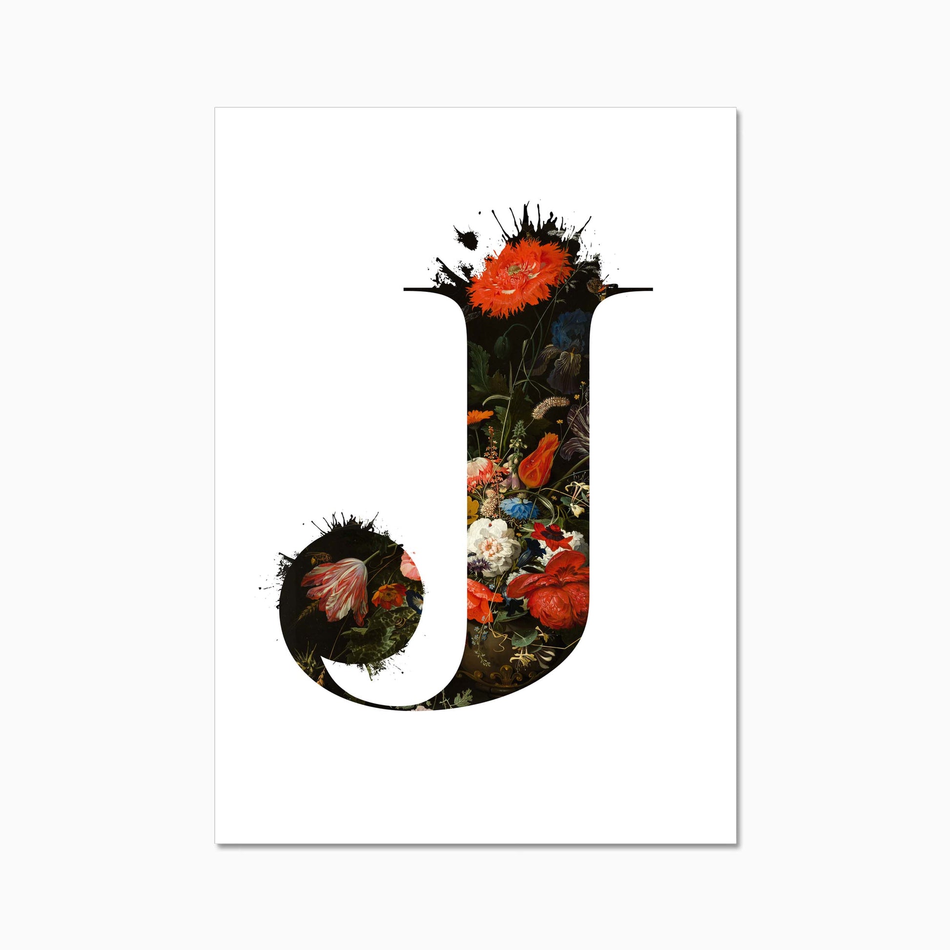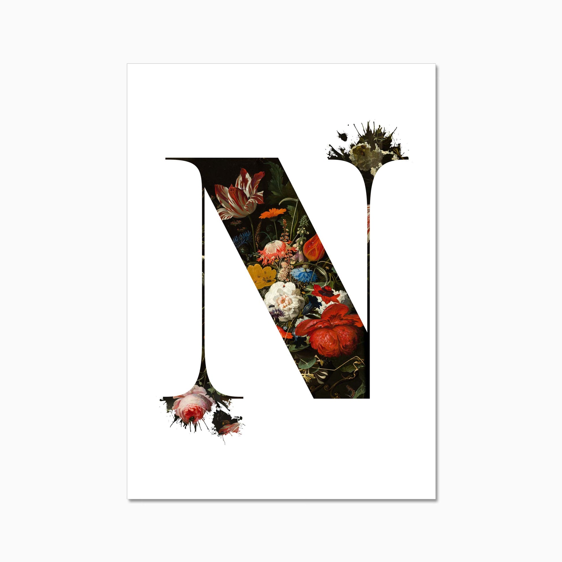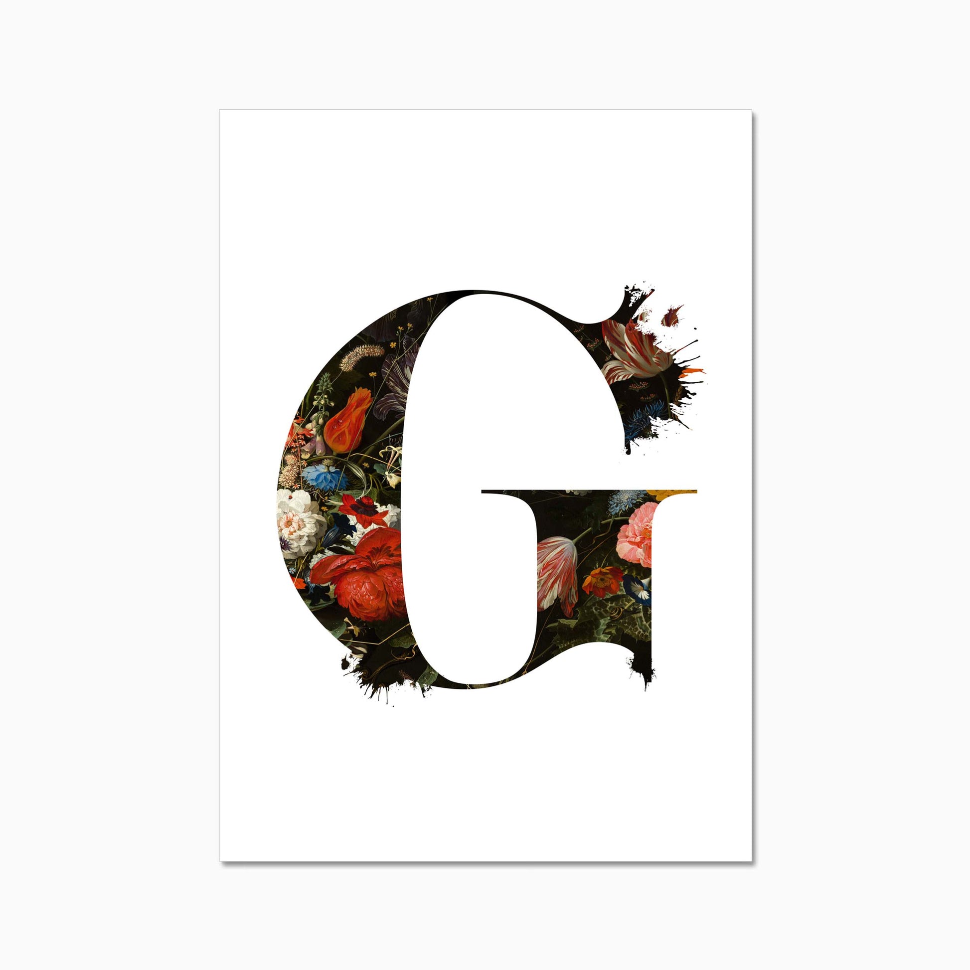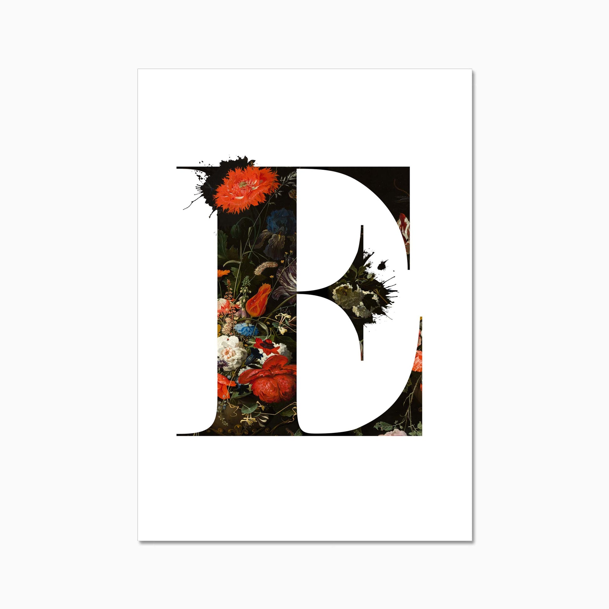 The letters are filled with a beautiful old dutch still life painiting featuring flowers and some little insects.