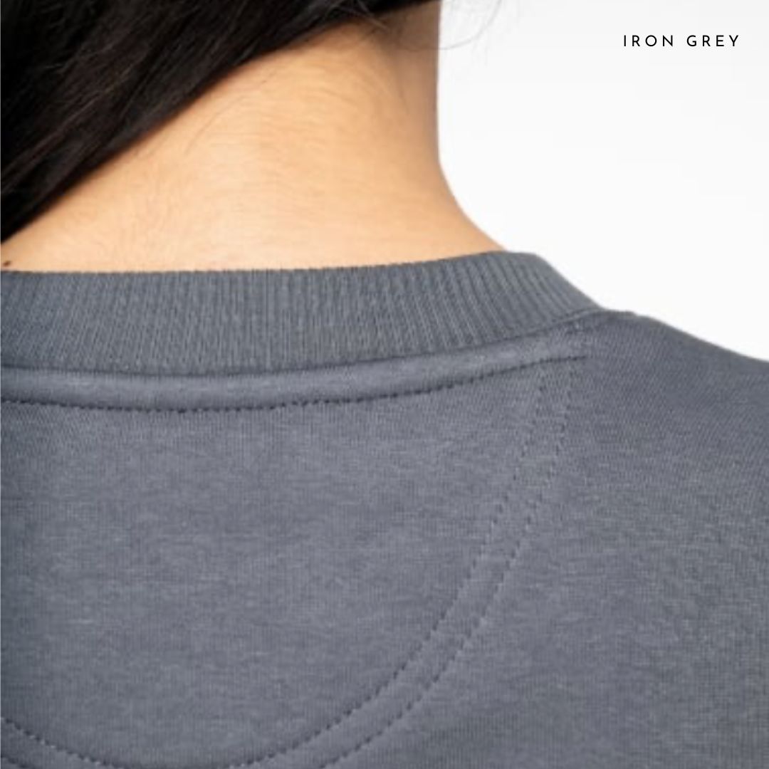 85 % organic cotton / 15 % post-consumer recycled polyester.Ringspun combed cotton.Enzyme washed.Oversized cut with dropped shoulders.Brushed 3-ply fleece, LSF (Low Shrinkage Fleece).1/2 circle in the back.2 x 1 rib neck, bottom hem and cuffs.Double overlaid overstitching on neck, cuffs and bottom hem.Tone-on-tone inner herringbone inner taped neck